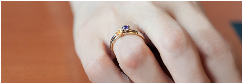 ・「 自分の誕生石をセンターに置いて、彼の誕生石をリングの内側にひっそりとセッティング・・・。 」